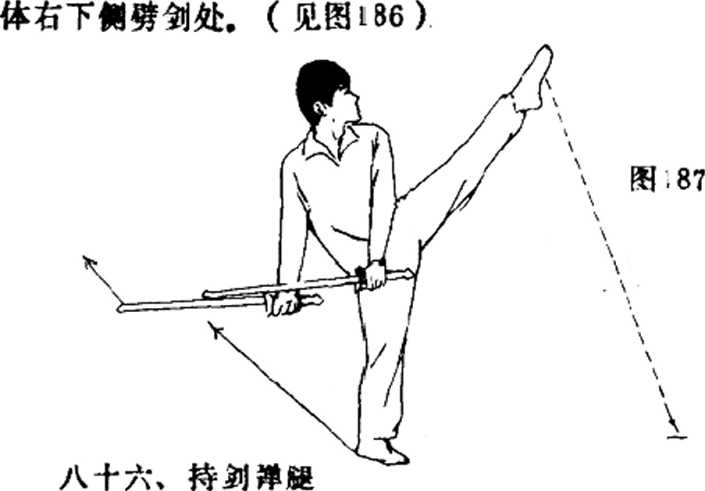 重心右移,体上升,双手劈训F动,左腿提起并向体左 图i88 侧5弹腿于头同高, (弹鼬时脚背绷直, 快而有力,力达脚尖 )右腿旌直她面,成, 右独立持剑左弹腿 势,目视左侧舞尖. (见图137)