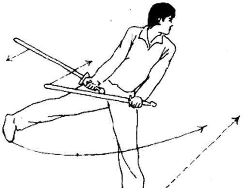 随即向右脚并步踏实,与此同时,两手持剑同动。左手持到 剑尖向前、向上随右持剑同时由体前上方随退步并脚过头E 方,向右外侧、向下逆时针划弧且劈刻位于右下侧,与胯同 高,两剑平行,持剑手心相对,成并步风膝双劈剑势,目视、