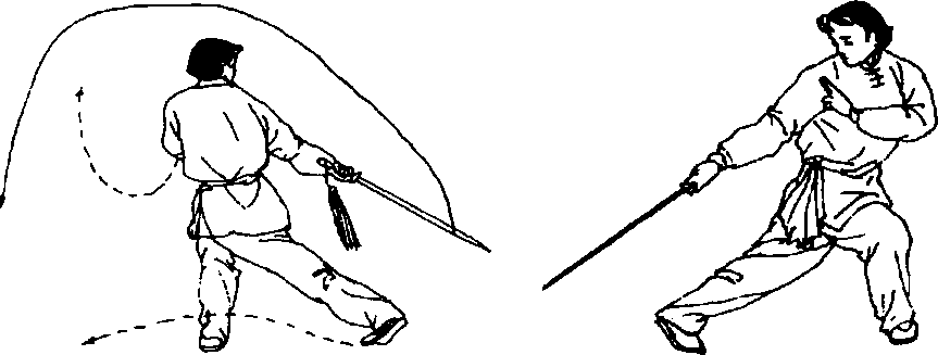 ② 上右步与回身截剑要协调一致,弓步与劈剑要协调一致;整 个动作要连贯完成不可脱节。