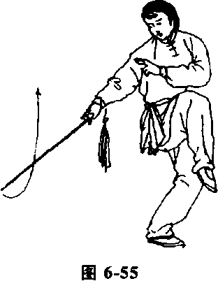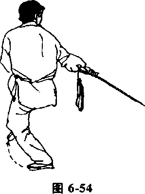 1. 随重心前移,右腿屈膝上提成独立式;上体右转并稍前倾; 同时,右手持剑向右后方截剑,左手剑指屈肘摆至右肩前,手心朝 右后;目视剑尖。(图6-54.55)