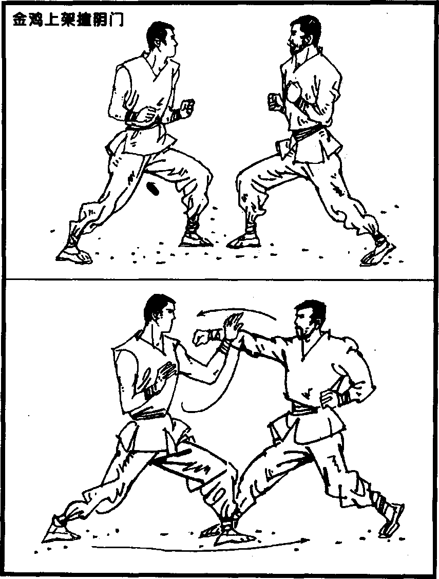 4 我右手紧随亦伸向对方肩部抓牢%手合力将对方向我方扳靠下部出右膝上抛撞其中盘腹部或阴门穴。我双手上攀对方双肩如金鸡上架振翅而前我抛膝撞腹击阴似黑豹登崖勇猛而上。