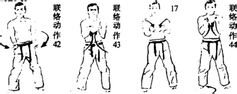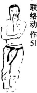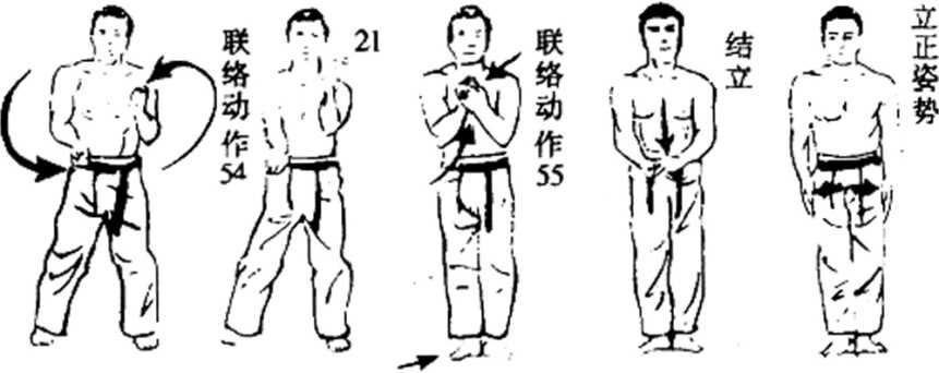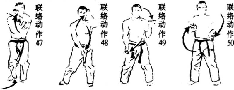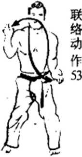 贯手招式,伹下一次的回受,要一面后退,一面做第二次。联络动作46?50(图507?511)右脚后退一步的同时,使出回接的招式,这和三战的型相同。图508 图509 图510图511(19)右三站立,两手贯手击(图506)三次的在受都要使出