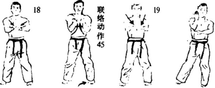 图500图502 图503(18)右三站立,两手贯手击(图504)和17的动作相同, 成为第二段的两手贯手击。联络动作45(图505>和第二段相同,左脚一面后退一步,一面以双手接招。 呼吸和动作要配合得恰到好处。图504 图505 图506 图507招的