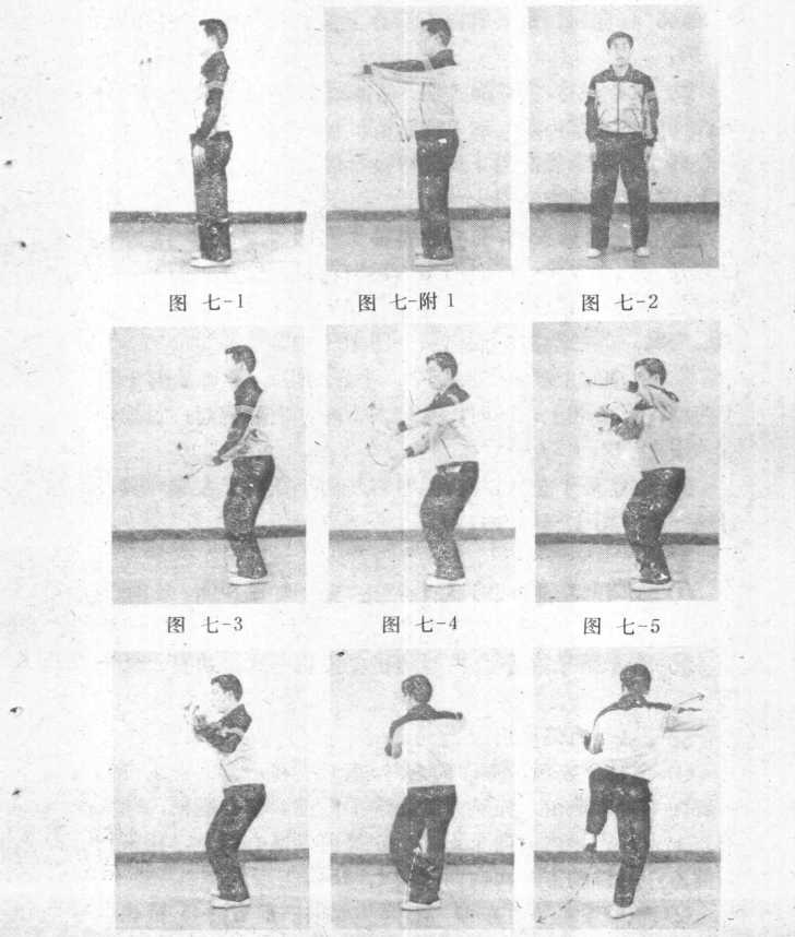身体继续向右转,重心全部移于左腿(图七-7>。随转体 右脚尖向外摆,重心全部移于右腿,左腿屈膝上提;目视左 前方,面向西(圉七-8、附8 )。