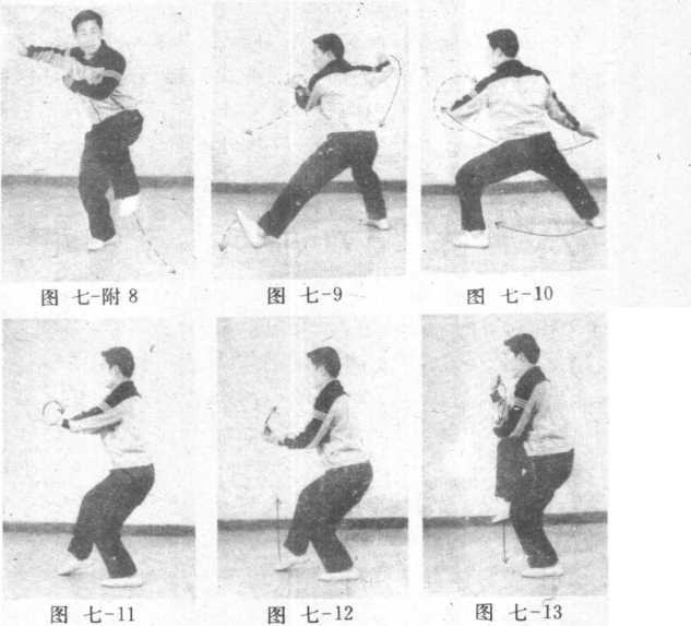 ① 此式为典型的大开大合动作。上肢的开合要配合两腿 的虚实转换,手合足开,.手开足收。右肘两次抬起小得有架 肘之意。转体时要以身领手,使动作圆满顺随。