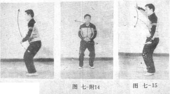 ① 身体微左转,随即向右转,重心右移;同时左拳变掌 内旋向上经左胸前,先顺缠变逆缠于额前,掌心朝前指尖 向左上方左掌内旋向下逆缠于左髋前,掌心朝下,指尖向 右前方;目视前方,面向西 <图七-15)。