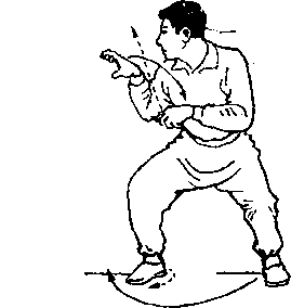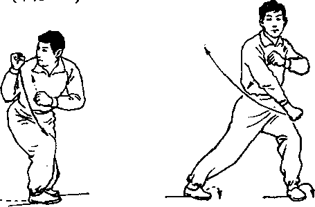 外旋,身体微右转成半斜 裆。同时,左拳变刁手,