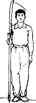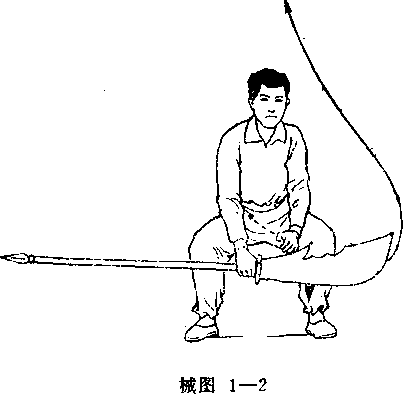 动作说明 立身中心,两脚并拢。右 手握刀柄前端靠近护手盘。刀 直立于身体右侧,刀刃向前, 刀镑靠右脚外侧。左手自然下 垂于左胯侧,目视前方(械 图 1-1 ) 1. 剁刀 右脚向右横跨一步,两腿屈膝下蹲成正裆。同时,右手 虎口用力使刀头向左下落;左手略向右伸,双手将刀按于膝 前,目视右前方。(械图1 一2 ) 动作要领:按刀和刀下剁时要松腰松胯,两手同时用 力。眼要随刀走。 (以下各式都要眼随刀走,不再赘述) 攻防方法:设对方用枪刺我左小腿,我持刀下剁,将来 枪按住。