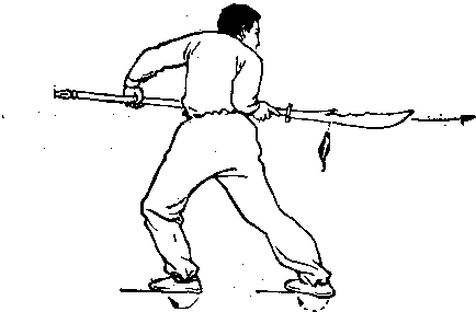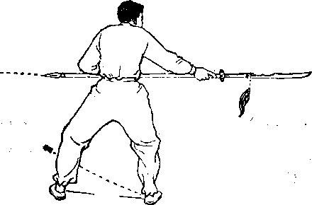 ① 左腿继续前弓,身体右转。同时,右腕内旋,使刀刃 转朝右,、刀随身转向右后方平抛,目视右后方 (械图1-32) 械图1—32 ② 左脚跟外旋,右脚跟内旋,身体微右转成半斜裆。同 时,两手推刀向右扎击,目视右后方 (械图1 一33). 动作要领:以上两个动作要连续完成刀随身转时要松 腰松脖,用腰臂之力将刀扎出, 攻防方法:设对方用枪从背后刺来,我转身向后抛刀,将 对方之枪拨出,并顺势还击。对方枪是直劲,我之抛刀是横 劲,以横劲破直劲易为反掌。这就是相传“关羽”留下的抛 刀式