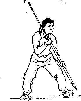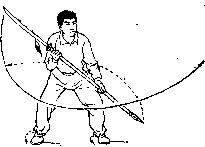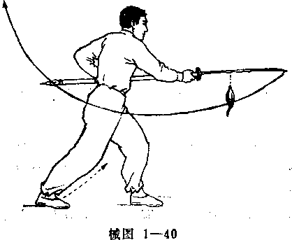 ③ 左脚跟外旋,右脚跟内旋,身体右转成右弓步同时, 左手向右前方推送刀镨划弧拦在两腿中间。(械图1 —38 )