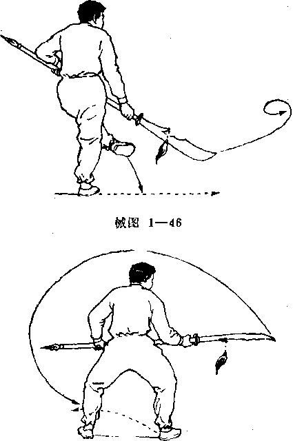 ④ 身体微右转,左脚向右前方抬起.同时,右手操纵刀 头沿顺时针方向划一立圆下带(械图1 —46)