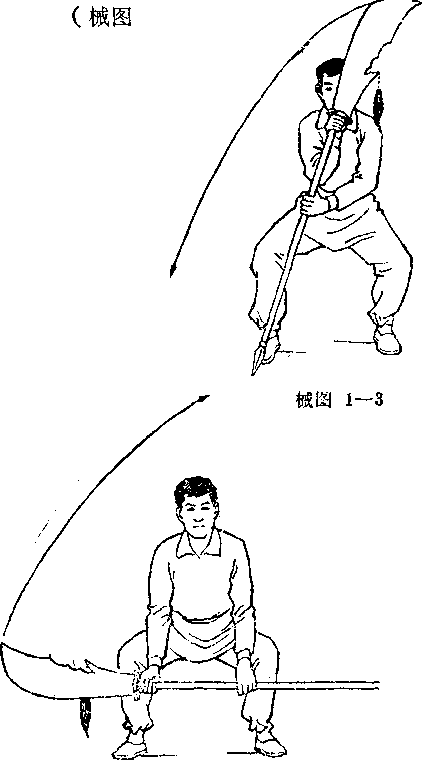 ① 右腕外旋上提,刀刃向左上方扬起同时左手右伸 接握刀柄中部。(械图 — 3 ) ② 左手握刀柄向左下方扳拉,右臂顺势伸直,刀刃向右 下方沉剁,双手将刀按于膝前。右手心同外,左手心向 内,目视前方。 械图.1 一4械图.1 一41 — 4 ) 械图.1 一4 械图.1 一4 动作要领:刀下剁 时应松松腰胯,并要有 寸劲。 攻防方法:对方挺 枪刺我头部,我举刀上 撩,将其枪拦出。对方 抽枪又刺我右小腿,我 操刀顺势向右下剁,将 其枪按住。