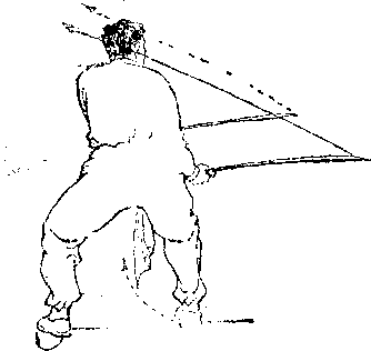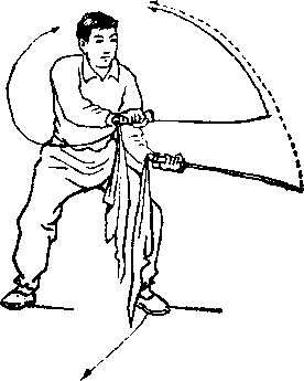 ④ 左脚蹬地跳起,身体右转,两脚同时落地成正裆.同 时,双刀向左下落,然后左腕外旋,右腕内旋,双刀向左前 方平拋,目视左前方,(械图3_5〇)