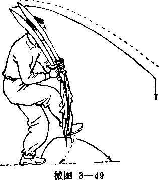 ①右脚跟外旋,身体左转,左脚抬起.同时,奴刀:上挑 至左肩前 (械图3-47)
