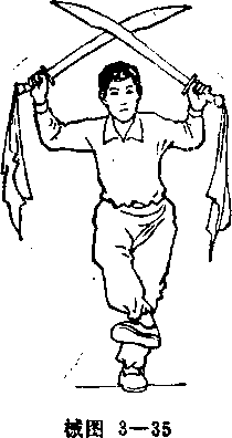 ① 右脚抬起。同时,双刀交叉向上架起,左刀在前,右 刀在后(械图3_35).