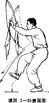 ④ 左脚落地.同时,双刀交叉回收至腹前时,向前 蹲,双刀则于左膝前,左刀在前,右刀在后,目视左前方 (械图3-38)