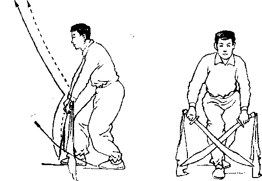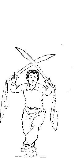 攻防方法:设对方用枪刺我头部,我双刀上挑,挑出其 枪对方抽惟又刺我腹部,我双刀下插,拦住其枪,同时后 刀粘住其枪,前刀顺枪杆前滑,削其持枪之手,双刀防中有 攻,攻中冇防,要灵活运用