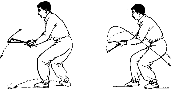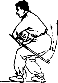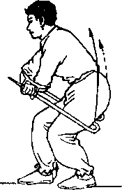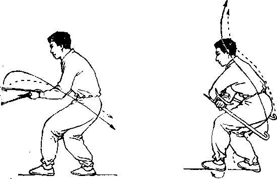 同时,两腕内旋,两钩交叉下压至膝前,随后右钩向左后方、 左钩向右后方斜插,两臂交叉于胸前。左臂在上,右臂在