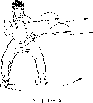 ① 右脚跟内旋,身体右后转,左脚向右方上一步成正 裆。同时,左腕外旋,右腕内旋,双钩乎行随转身向右划弧 外拋。右钩在上,左钩在下 (械图4-15)