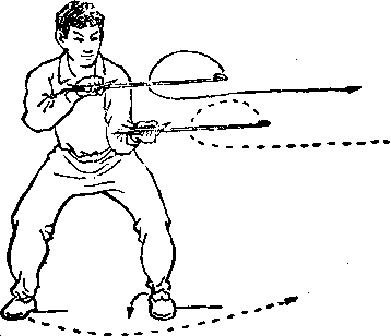 ④左脚内旋,兑左后转,右脚向左方上一步成正 裆。同时,左腕内旋,右跪外旋,双钩平行随转身向左划弧 外抛。右钩在上,左钩在下,视左前方。(械图4-〗8)