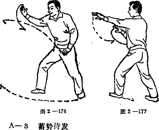 B- a蓄势待发 B- a蓄势待发—lli—lli图 2 —178图 2 —178图 a—179图 a—1791 左掌右推 由冲出之左拳变掌, 就势右推,约四十五度。 如图2—80