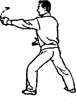 右手向右平揉,要划够一个平國圈,旋又作拳、 屈肘,置于右胁,拳眼朝上同时左拳辩右推
