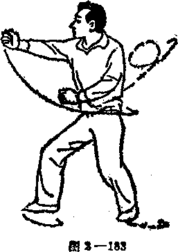 —4 进步冲拳 继上动作,右脚向前 踏出一步,右拳从左腕上 穿过随势前冲,成半马 步。如图2—183