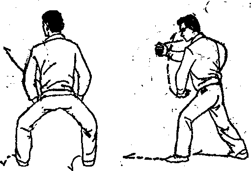 携土鞠彝,泰拳右击之痕,敌必以右手觸握我整 腕,我随将左脚右移半步,右脚更向右移,乘机,释 右手作拳,急从敌右腕下穿过,身徇右转约九十度, 右拳仰臃上挑,左拳仰腕下压,欢臃相隹,形成剪刀 形状,瓤身节縳助势,成坐马步。如齒2—2