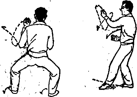 左脚更向左移。同时,以左拳从敢左臂下穿过,身向 右转约九十度,右拳仰腕下压,左拳仰腕上,两小 臂(主要用腌力)形成剪刀形状,身向下蹲成坐马 步。如远用得当,可折敌腕。