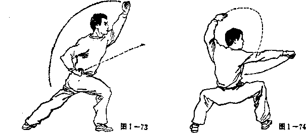 动作分解 ① 左臂屈肘向前上方架起,拳眼朝下;右拳屈肘收抱于右 腰侧,拳心朝上,其余不变(见图1—73)。 ② 动作不停。上体稍左转,两腿屈膝半蹲,成马步。与此 同时,左拳变掌屈肘上架于左额前上方;右拳迅速向右(向 东)平伸冲出,拳与肩同高,拳心朝下。眼向冲拳方向注视 (见图 1 —74 ) 要领说明 成马步时,两大腿必须蹲平,两脚尖里扣,至少要两脚平 行。右拳要螺旋形前冲,并要利用腰力,使冲拳富有爆发力 第四段