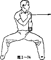 ② 上动不停,左脚随即迅速向身体左侧方迈出一步,两腿 屈膝半蹲,两脚尖内扣,成马步,身体右转四十五度;同时, 左拳由下向体后、向上弧形绕转一周后收于左腰间,左臂屈 肘,肘尖朝体后方,左拳心朝上,右手姿势不变?两眼平视体 左側方(见图3 —74 )。