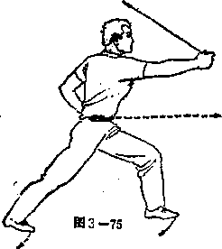 ① 重心向身体左侧移动,右腿 蹬直,右脚尖内扣,左腿屈膝半 蹲,成左弓步,上体左转九十度; 同时,右手握拳向体前方猛击,力 达拳面,拳眼向上,右臂伸直与肩 同高,左手姿势不变;两眼平视体 前方(见图3—75)。