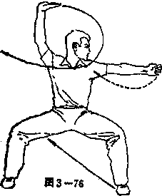 ② 上动不停。左脚蹬地,右脚 尖外展四十五度,左脚尖内收四十 五度,两腿屈膝半蹲,右脚尖内扣, 成马步,身体右转九十度;同时,右 拳变掌,右臂向上横架,右臂微屈, 右掌心朝上,掌尖指向身体左侧 方;左拳从左腰间向体左侧猛力击 出,左臂伸直与肩同高,左拳眼朝 上;两眼看左拳(见图3 — 76)。