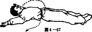 动作分解 整个身体突然向左后翻身 成仰卧,两臂随之左、右伸开 (见图 4 —67 )。 要领说明 翻身时,要先使身体略离地悬空后再翻,动作要突然敏 捷,仰卧时,给人有大醉的形象