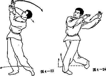② 紧接上动右脚向前(向西)方向落一步(见图4 一 23) 0