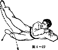 ⑦ 身体侧摔倒地。左腿伸 直,以腿的外侧触地;右腿屈 膝,以全脚掌击地两手屈肘用 力下拍地面。眼向左脚方向注视 (见图 4—28)。