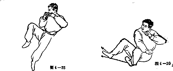 ⑥ 在空中。右腿向前(向西) 上方挺膝踹出,左腿屈膝上摆。身 体成侧卧状态(见图4 一27)。