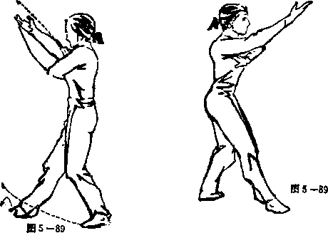 ① 右脚向右斜45°方向落步,左脚微屈膝,同时,左手由 上向右前下按,掌心朝下,掌指朝右,右拳变掌从左掌背上面 向前穿出,随之,左手收于右腋下,掌心朝下。眼视前方 (见图5 — 89正反面)。