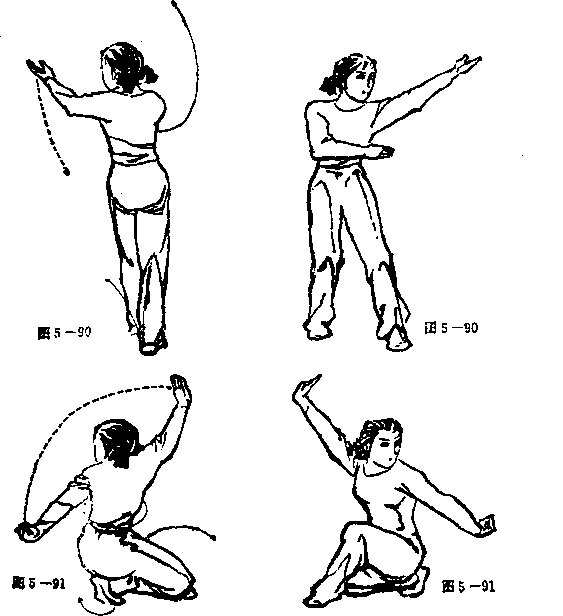 ③ 右脚向左脚后面插一步,两腿屈膝全蹲,成歇步。同 时,左手手臂内旋向后平划圆后成勾手9勾尖向上右手经胸 前,向右、向上划圆至右额前上方抖腕亮掌,掌指朝左,掌心 朝前上方。眼视左前方(见图5 — 91正反面)。