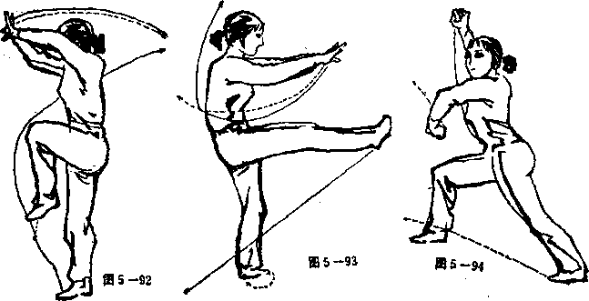 ② 上动不停。右脚燈地起跳后,从左向右做孤形摆踢,脚 面绷紧。同时,两掌心向下,分别桕击右脚背,身体右转 360 (见图 5 — 93)。