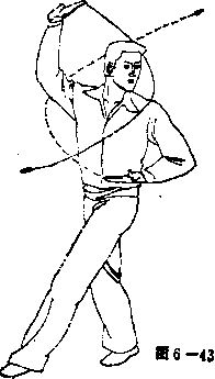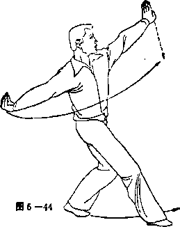 动作分解 ① 右脚震脚成左虚步,同时,左勾手变掌叉在腰谢,掌心 向上,成仰掌,眼看左方(如图6—43 )。 ② 上动不停。身体向右,向后转体,在转体的同时左掌从 腰间向上辑起,至上方时屈腕成横掌,屈肘横架于头顶斜上方, 掌心朝前,同时,右掌从上向左肩前落下,再向下、阳布后 方,直臂弧形绕行成勾手,勾尖朝上(如图6 — 44)。 第五段 ?