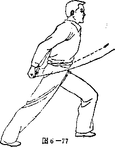 动作分解 ① 左脚向左落下成左弓箭步,同 时,左拳变掌搂膝向左后组拳,右拳下 落身后,两拳成反仰拳,脸朝东,眼平 视(如图6 — 77)。 ② 上动不停。两拳从后向前至胸前 平抱两臂交叉相叠,右拳在上,左拳在 下,拳心朝下,眼平视(如图6 —78 )。 ③ 上动不停。两拳向左、右两侧平 冲,眼看右拳(如图6—79) 第八段