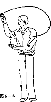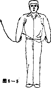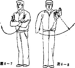 动作分解 ① 左掌从身后由下向 前弧形绕行,至胸前平举, 手向心上,右掌由下向右 后侧斜上举,眼看右掌,两 脚不动(如圆6—6 ② 接上动。左掌变立 掌,掌心向右方,同时, 右掌从右上侧绕行至左肩 降落,左攀在内右掌在 外,两脚不动,眼向前乎 视(如图6 — 7 )。 ③ 接上动。左掌向前 平推,同时右掌从胸前向 后直臂弧形绕行至身后, 五指撮拢屈腕成勾手,两 脚不动,眼看左掌(如图 6 — 8)〇 麥领说明 左掌平推,右掌向后成勾手时,必须缓慢有力,乎推和往 后勾相合。