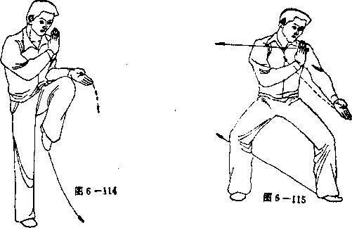 动作分解 ① 上动不停。左插掌提起后,屈臂放在左腿外侧,眼看左 掌(如图6—114)。 ② 上动不停。左脚下落成马步,左掌继续向左下侧插出, 右掌不动,眼看左掌(如图6 —115 ) 第十段