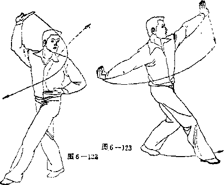 动作分解 ①右脚震脚成左虚步,同时,左勾手变掌叉在腰间,掌心 向上成仰掌,眼看左方(如图6 —122)。 ②上动不停。 身体向右转,在转 体的同时,左莩从 腰间向上提起,至 上方时屈腕成横 掌,屈肘横架于头 顶上方,掌心朝前; 同时,右掌从上向 左肩前落下,掌变 勾手,再向下、向 右后方直臂弧形绕 行,勾尖朝上(如图6 —123 )。