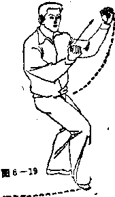 动作分解 左脚跟上半步放 在右脚跟旁成右虛 步,同时,左拳提至左 额前拳心向外,屈臂,并向胸前砸下,右拳从 腰间放在胸前左臂上面,眼看左拳(如图6 —19).