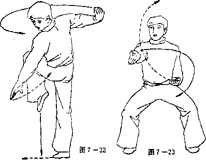 ① 向左拧腰,同时,左手向下沿左小腿外侧下格,右手不 变,眼看左手方向(见图7—22 )。