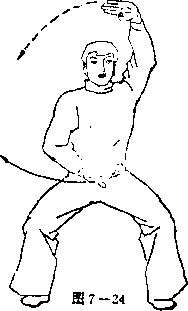 .此同时,左手收回到左腰间,掌心朝上;右手变掌,臂外旋随 转体直臂向体前平摆,掌心朝上,与肩同高,眼向右手注视 (见图 7—23)。
