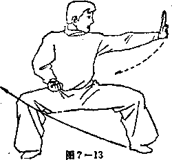 动作分解左脚向左(向东)移步,两腿 屈膝半蹲,两脚尖微向里扣,成马 步势。同时,身体稍右转,左手由 东向上、向西、向下、向东回环上 挑,掌指朝上,掌的小指一侧向东 (在向上挑掌时,身体要微向左 转),掌指与眼同高,右手不动,眼随左手,并向东方向平 视(见图7—13 )。要领说明手、眼、步要协调一致,上挑掌要有力。