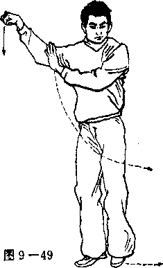 ① 右腿膝撖屈站立,左腿膝微屈以左脚尖虚点地面,并位 于右脚旁。右手臂微屈举于体右侧屈腕成吊手,勾尖朝下左 手位于右肩前,臂微屈,手心朝里。此时为吸气(见图 9—49 ) 〇